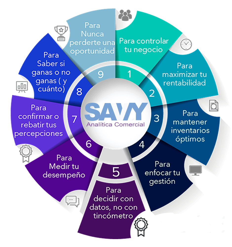 Primero porque Savvy te entrega todas las métricas comerciales de tu negocio para medir y analizar cada ámbito, en una aplicación de analítica amigable y fácil de leer.